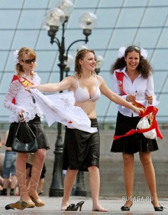 Выпускницы совсем не стеснялись оголяться на публике в центре столицы, после купания в фонтанах сушили одежду, размахивая ею.