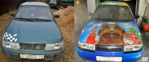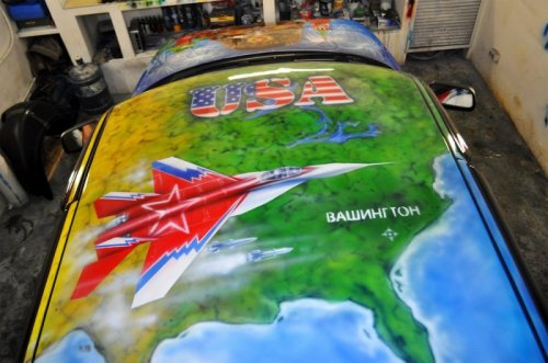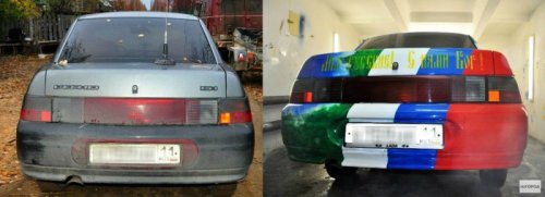 "Наш патриотичный автомобиль очень озадачил сотрудника ГИБДД, долго думавшего, как же обозначить цвет. В конце концов определил – цвет комбинированный", - смеётся 24-летняя художница-аэрограф.