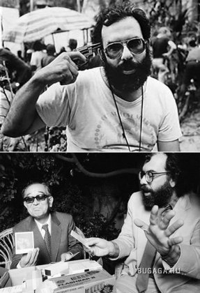 На фото сверху - Фрэнсис Форд Коппола на съемках Апокалипсиса. На фото снизу - Фрэнсис хвастает новым полароидом перед Акирой Куросавой, 1980 год.
