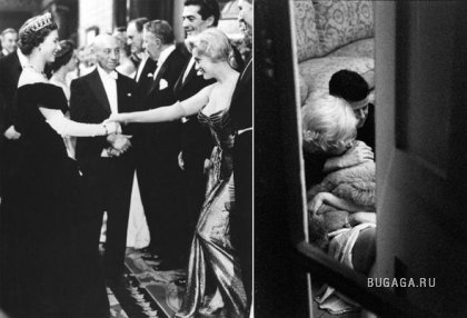 На фото слева - Мэрилин Монро знакомится с королевой Елизаветой Второй в Лондоне, 1956 г. На фото справа - Мэрилин Монро и Джон Кеннеди