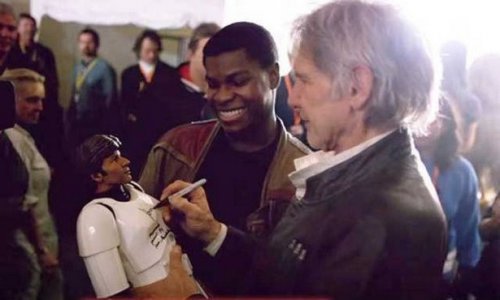 Британский актёр Джон Бойега берёт автограф у Харрисона Фордам