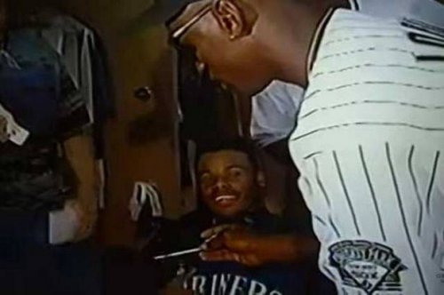 Майкл Джордан просит автограф у известного американского бейсболиста Кена Гриффи