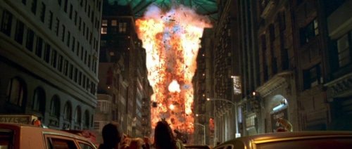 Для этого они перевернули модель Нью-Йорка на бок, вертикально, создав то, что они назвали "смертельной трубой". Пиропатроны взрывались в самом низу декорации, а камера снимала с вершины макета. В результате получился эффект, что огненная мощь стреляет горизонтально. Довольно простой, но очень эффектный трюк.