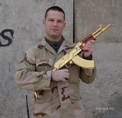 Особым блеском – в буквальном смысле - выделяется золотой автомат Калашникова АК-47. Он принадлежал бывшему иракскому лидеру Саддаму Хусейну, который славился своей любовью к оружию.