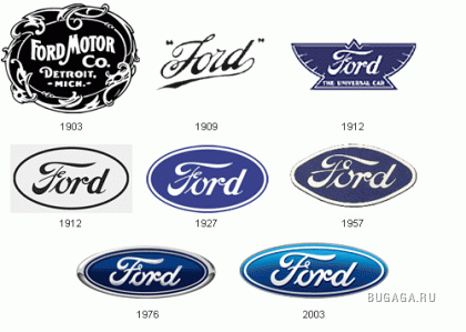 Правая рука м-ра Форда Гарольд Уиллс зарабатывал в молодости деньги тем, что печатал визитные карточки, поэтому, когда Генри начал в 1903 искать эмблему, он стер пыль со своего старого печатного аппарата Джон Булл. Отпечаток остался еще от его собственных визитных карточек. Овал появился в 1912, а синий цвет был добавлен в 1927 для модели А.