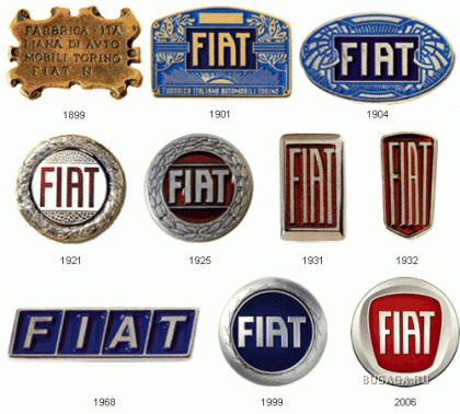 Сначала Фиат использовал эмблему, состоящую из пяти лучей на модели Uno в 1982, это произошло после того, как однажды главный конструктор Фиата Марио Майоли проезжая ночью мимо завода Mirafiori после того, как выключили освещение, увидел на крыше завода огромный логотип FIAT на фоне темнеющего неба. Он быстро сделал набросок — пять лучей изображали просветы, которые были видны между буквами. Мазератти Как и у автомобилей Альфа, символ Мазератти — следствие гордости своим городом — трезубец является традиционной эмблемой Болоньи, где производились эти автомобили.