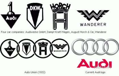 В 1932 году 4 германские фирмы DKW, Audi, Horch и Wanderer объединяются в автомобильный концерн Auto Union. Логотип Audi (всем известные четыре кольца) символизирует союз четырех ранее независимых автомобильных производителей, известный как "Auto Union": Audi, DKW, Horch и Wanderer. Автомобили этих производителей наряду с собственными логотипами несли знак группы в виде четырех сплетенных колец, символизировавший нерушимое единство четырех фирм-основателей.
