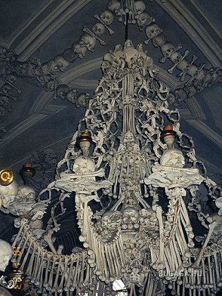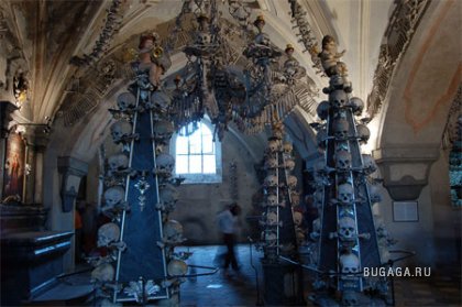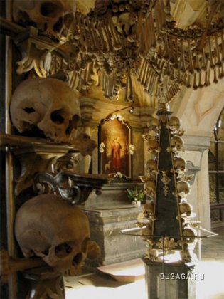 Посреди кладбища в городке Кутна Гора, что в шестидесяти километрах к востоку от Праги, высится странная церковь. С ее куполов, словно с мачт пиратского корабля скалится Веселый Роджер. Внутри никто не приклоняет колен и не зажигает свечей, ведь молиться здесь некому. Вместо ликов святых - черепа, вместо алтаря - пирамиды, сложенные из костей, словно на картине Верещагина "Апофеоз войны". В общем, зрелище не для слабонервных.