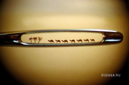Караван из 7 верблюдов в игольном ушке.Высота верблюдов-0,20-0,28 мм.