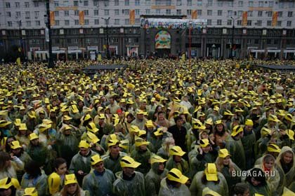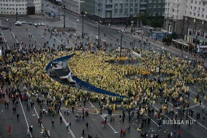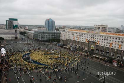 Напомним, целью акции было построение на главной площади Челябинска гигантского компьютерного смайла, который можно было бы сфотографировать не только с вертолета, зависшего на высоте птичьего полета, но и из космоса. Фотосъемка состоялась с одного из искусственных спутников Земли, ход которого по орбите был специально скорректирован так, чтобы он в нужный момент прошел над Челябинском. Причем для этого в Челябинске была впервые применена технология моделирования погоды – чтобы вид челябинского смайла из космоса не закрыли тучи. В акции могли принять участие все желающие с единственным условием – обязательное наличие одежды желтого цвета. В результате более 9,5 тыс. человек, которые начали подтягиваться к площади за несколько часов до сеанса фотосъемки, образовали собой улыбку площадью 75,28 метра. Добавим, что уже отправлены документы в штаб книги рекордов Гиннеса в Лондоне.