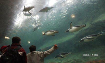 Дети наблюдают за плавающими пингвинами в аквапарке Вупперталя, Германия.