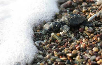 Новорожденная головастая морская черепаха ползет в сторону моря в заливе Кипариссия в Греции.