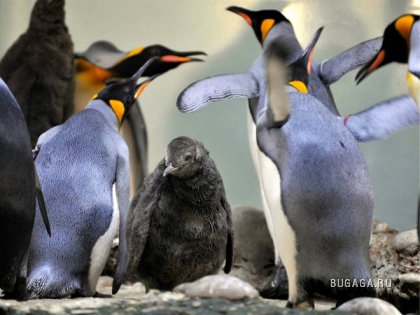 Взрослые королевские пингвины окружают самку в зоопарке в Базеле, Швейцария.
