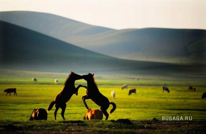 Кони дерутся на пастбище вблизи китайского города Чифэн.