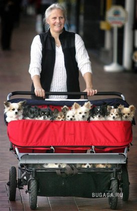 Робин Крук везет на прогулку своих 18 собак (все они на половину чихуахуа) в коляске для тройняшек в центре города Таранга, Новая Зеландия.