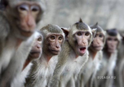 Обезьяны сидят в ряд в городе Лопбури, Таиланд. Страна запустила программу контроля рождаемости, в ходе которой самцов кастрируют, чтобы сдерживать их популяцию.
