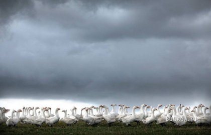 Стая гусей пасется на холме Шропшир в Англии. Этих птиц выращивают для рождественского сезона в Шрусбери, Англия.