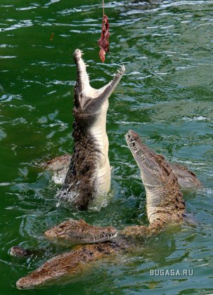 Крокодилы тянутся за куском мяса во время кормежки в парке для крокодилов в Маниле, Филиппины.