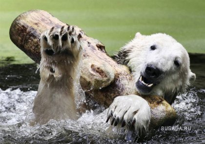 Белый медведь Кнут играет в воде в своем вольере в Берлине.