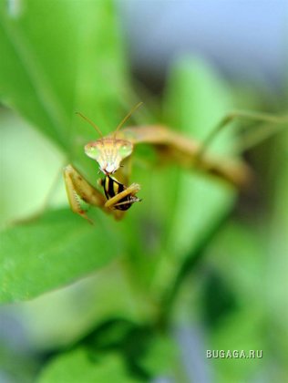 Снимок богомола, сделанный в Лос-Анджелесе. Богомолы - настоящие хищники. Известны случаи, когда более крупные особи охотились даже на маленьких ящериц, лягушек, птиц, змей и даже грызунов. Многие особи поедают себе подобных.
