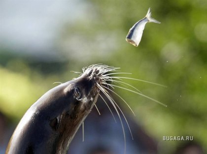 Морской лев готов поймать кусок рыбы, брошенный ему смотрителем зоопарка в городе Штутгарт, Германия.