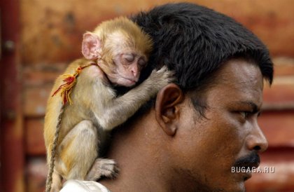 Трехмесячная обезьянка спит на голове своего владельца в Аллахабаде, Индия.