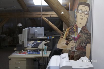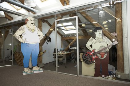 Все просторное офисное пространство 2×2 уставлено фигурами героев мультиков и всевозможным реквизитом, которые остаются на память после мероприятий и съемок промо-роликов. Офис телеканала часто используется еще и как студия. Поэтому студийный свет, штативы и видео-мониторы посреди помещения никого не удивляют.