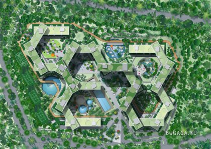 Новый комплекс коллективного жилья в Сингапуре существует пока в виде проекта, но уже локализован на карте местности. Это концепт, представленный голландской студией архитектуры OMA, именуемый The Interlace. Он состоит из 31 сложенного в пирамиды блока, которые вмещают 1 040 квартир на 170 тысячах квадратных метрах площади (и 8 гектарах местности).