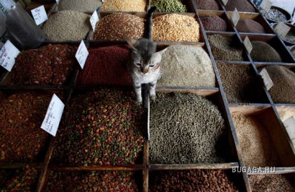 Кот на витрине с едой для домашних животных. Рынок в Бангкоке, Таиланд.
