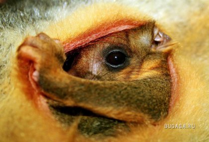 Щеткохвостый опоссум выглядывает из сумки матери в ветеринарной клинике в Сиднее, Австралия. Детеныш живет в сумке до 5-6 месяцев.