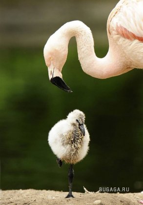 Чилийский розовый фламинго смотрит на своего двухнедельного птенца в зоопарке Bronx в Нью-Йорке.