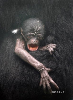 Двухдневный детеныш сиаманга зевнул в объятиях матери. Центральный зоопарк в Катманду, Непал.