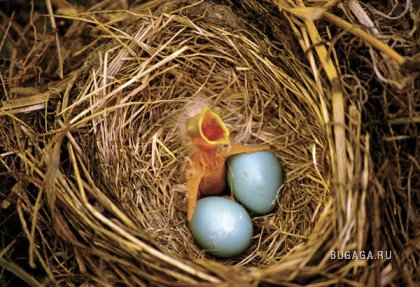 Странствующий дрозд, горы Беркшир, штат Массачусетс. Фотограф Дэвид Штайн шел по своему заднему двору, когда вдруг увидел это гнездо с яйцами. Через несколько недель он увидел этого новорожденного птенца, ожидающего свою мать.