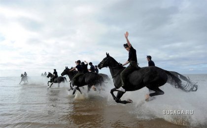 Стрелки Отряда Королевской Конной Артиллерии скачут на лошадях в морскую воду на берегу около Блэкпула, на северо-западе Англии.
