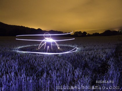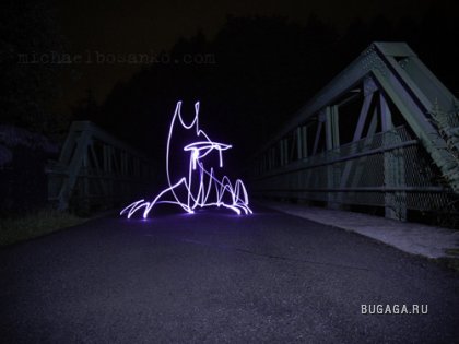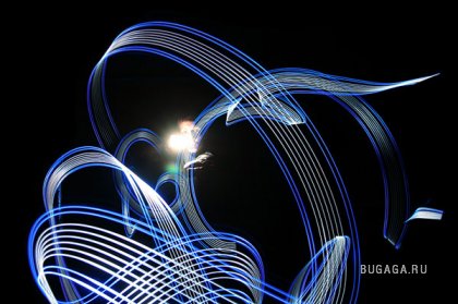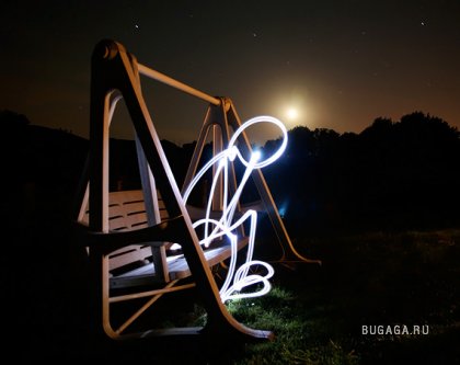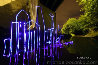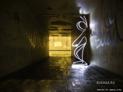 Снимать нужно в темноте, желательно поздно вечером на каком-нибудь красивом фоне, но из-за погоды пока особого желания выходить на улицу не было и я снимал в комнате. Ставим камеру на штатив, ставим ручной режим, выдержку Bulb, диафрагму поджимаем в зависимости от освещения и желаемого результата, подсоединяем спусковой тросик и начинаем рисовать. Если нет тросикка, то просто задержку 10 секунд и выдержку на максимум. Принцип рисования, как маркером по стене, только без стены Только есть одно но, писать надо в зеркальном отражении (если произвольный рисунок, то разницы нет, а если текст, то надо немного потренироваться чтобы с легкостью писать слова в зеркальном отражении, если фон сделать черным, то с текстом тоже можно не заморачиваться и писать нормально, потом в редакторе просто отразить). Снимать лучше в RAW, потом проще обрабатывать. Процесс обработки произволен, я например задирал по максимуму контрастность и балансом белого делал рисунки цветными, можно потом наложить например полупрозрачный градиент или текстуру.