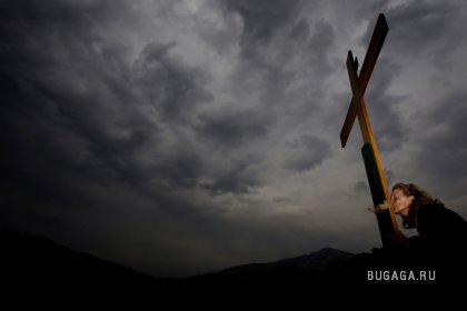 Верующая целует огромный деревянный крест во время ритуала, имитирующего снятие Иисуса Христа с распятия у монастыря Пендели, недалеко от Афин, 2 апреля. (AP Photo/Petros Giannakouris)