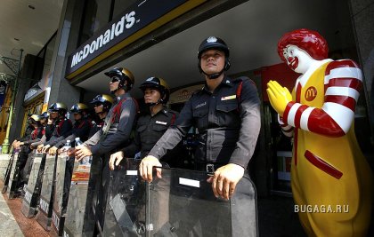 На страже: полицейские офицеры оградили McDonald's в Бангкоке. Десятки тысяч протестующих, одетые в символичные красные рубашки, забрасывают полицию яйцами и проталкивают баррикады, требуя отставки нынешнего главы правительства Абхисита Ветчачивы и проведения досрочных выборов. В понедельник власти страны отказались выполнить эти требования. В результате демонстранты «Красные рубашки» облили кровью, собранной у участников демонстрации, ворота Дома правительства в Бангкоке в рамках акции протеста. (Vincent Yu/Associated Press)