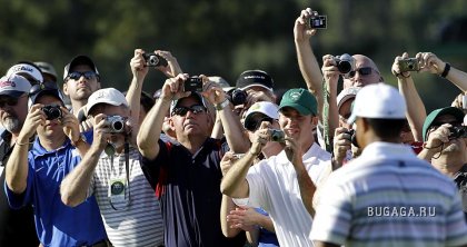 Зрители фотографируют Тайгера Вудса во время тренировки в преддверии турнира по гольфу «Masters» в Августе, штат Джорджия. Признавшись на пресс-конференции, что он совершал «невероятно ужасные поступки» в своей личной жизни, Вудс также заявил, что по-прежнему намерен выиграть турнир, который начнется в четверг. (David J. Phillip/Associated Press)