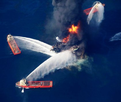 Смерть застигла нефтяников в море: в Мексиканском заливе произошел взрыв на нефтяной платформе Deepwater Horizon, расположенной в 80 километрах от берега Луизианы. В момент трагедии там было 126 рабочих. 11 из них пропали без вести, 17 получили ранения или ожоги. Выживших подобрали спасательные суда и военные корабли. (Gerald Herbert /AP)
