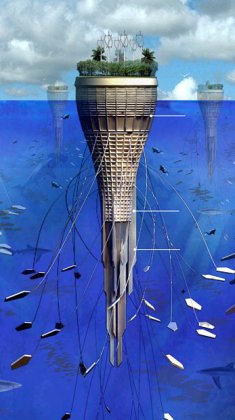 Концептуальный проект Water-Scraper – это настоящий мегаполис в океане. Сооружение рассчитано на то, что в будущем для части человечества подводный мир станет постоянным домом. Основная идея Water-Scraper – полное самообеспечение его населения. Так, генерировать электричество здесь поможет энергия волн, ветра и солнца, создавать продукты питания – методы аквакультуры и гидропоники. Удерживать же «баланс» здание будет благодаря системе балластов и щупальцеобразным отросткам, также собирающим кинетическую энергию волн. Автор проекта Water-Scraper – дизайнер Сарли Андре Бин Сакрум. (Building Design Art/Solent)