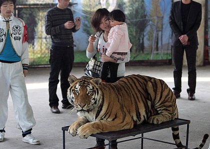 Китайский зоопарк осуждают за то, что он позволяет посетителям гладить тигра и даже «оседлать» полосатого хищника. Посетителям Зоопарка Вэньчжоу, провинции Чжэцзян, разрешают делать фотографии сидя верхом на тигре (тут стоит отметить, что посетители лишь притворяются, что садятся на спину животного). Зоопарк устраивает ежедневные 20-минутные тигровые представления, после чего приглашает всех желающих потрогать могучую кошку. За тигром следят трое мужчин, четвёртый делает фотографии, и ещё одна женщина взимает за это удовольствие 30 юаней (£2.85). Представители зоопарка настаивают на том, что это абсолютно безопасно, поскольку тигр ручной, а его клыки и когти спилены. (QUIRKY CHINA NEWS / REX FEATURES)