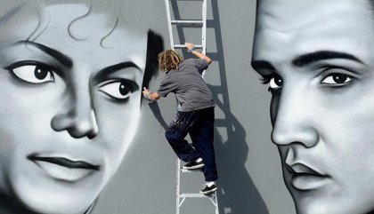 Художник Оуэн Диппи вносит последние штрихи к его граффити «Два короля рок'н'ролла», в Тауранга, Новая Зеландия. (AP)