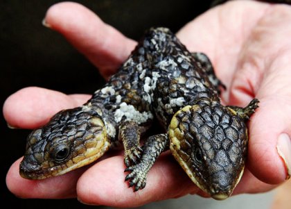 Двухглавая ящерица из семейства сцинковых рассматривает свой новый дом в парке рептилий Хенли-Брук, город Перт, Австралияна. Рептилия была замечена на пляже Куджи и спасена, и, похоже, дела идут хорошо. (GETTY)