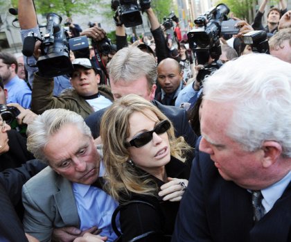 Майкл Дуглас (Michael Douglas) и его бывшая жена Диандра выходят из здания суда на Манхэттане. Их сына осудили на 5 лет тюрьмы за торговлю наркотиками. (Louis Lanzano-AP)