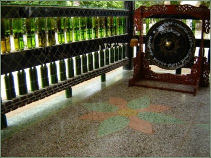 На все про все ушло больше полутора миллиона бутылок разного калибра, цвета и объема. Из них состоит и пол, и крыша, и стены, и колонны, а крышечки монахи использовали для украшения наружной стороны стен. Удивительный материал, - говорят они, - долговечный, прочный, дешевый, пропускает естественный свет и не выгорает на солнце.