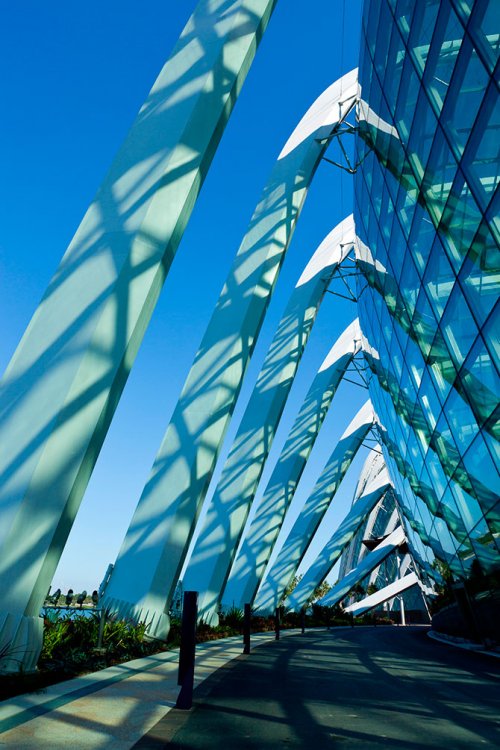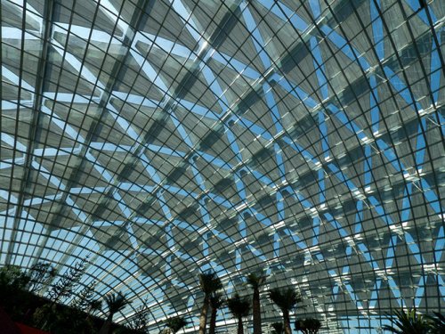 Архитектурное строение восхищает кажущейся хрупкостью и легкостью. При строительстве использовалось специально разработанное стекло, поглощающее излишки солнечного света. Кроме того, на крыше куполов установлены специальные выдвижные паруса, позволяющие создать тень для растений при повышении максимально допустимой температуры. В конструкции полов скрыты специальные трубы с холодной водой, благодаря чему внизу удерживаются прохладные воздушные массы, в то время как теплый воздух поднимается к вершинам куполов. На специальной солнечной электростанции генерируется требуемый объем энергии. Все это обеспечивает идеальные условия для растений вне зависимости от существующих погодных условий.