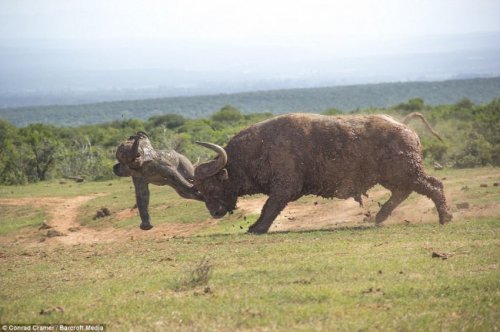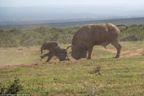 Буйвола, естественно, это ничуть не испугало. Он дождался, когда задира окажется в пределах досягаемости, и просто-напросто быднул его головой. Слонёнок от удара отлетел на несколько метров и благополучно приземлился на африканскую саванну.