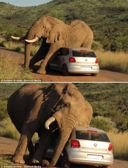 Два запуганных пассажира этого Фольксвагена Поло (VW Polo) оказались не в том месте, не в то время, когда гигантский слон остановился, чтобы потереться о крышу и капот автомобиля. Невероятные кадры были сделаны в августе 2014 года 21-летним Армандом Гроблером (Armand Grobler), гидом и управляющим гостиницы в Национальном парке Пиланесберг (Pilanesburg National Park) в Южно-Африканской Республике.