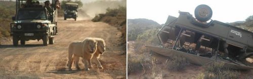 Львы окружили автомобиль, который опрокинулся на бок, когда водитель Наташа ван дер Мерве (Natasha Van der Merwe) поспешно попыталась дать обратный ход, спускаясь вниз по крутому склону. Туристы утверждают, что она подъехала слишком близко к животным, а затем не хотела сразу звать на помощь, как только автомобиль с открытой боковой поверхностью перевернулся.