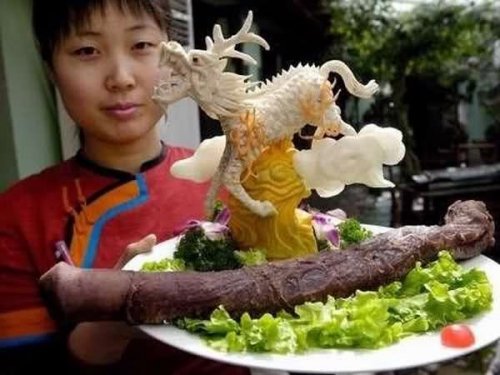 Это блюдо подается в одном известном ресторане Китая под названием «Дракон в пламени желания» (такой фразой китайцы описывают искусно приготовленный пенис яка). Ресторан Guolizhuang, расположенный в Пекине, славится блюдами такого характера, чем привлекает туристов. Кроме того, местные жители тоже не брезгуют им, поскольку считается, что блюдо очень полезно для кожи.